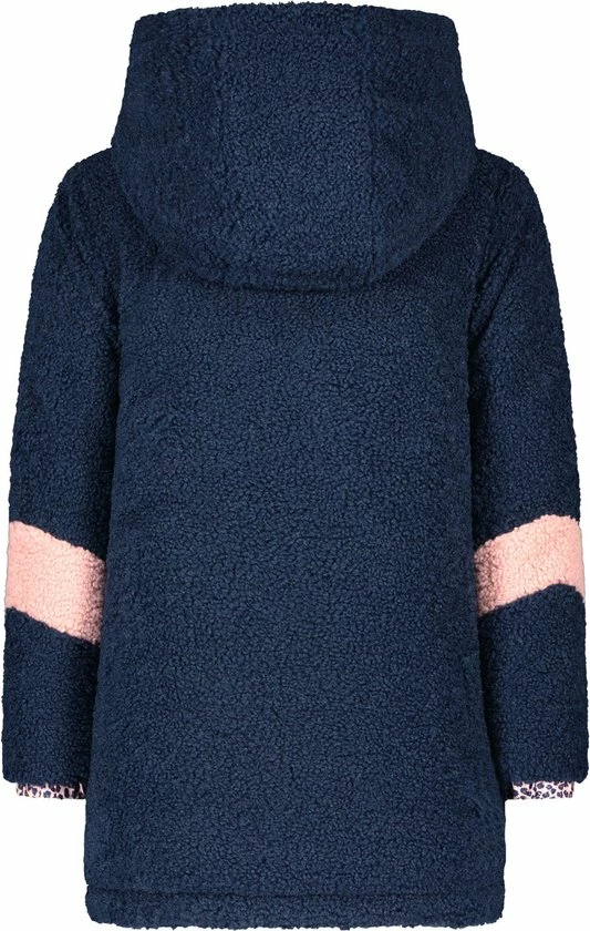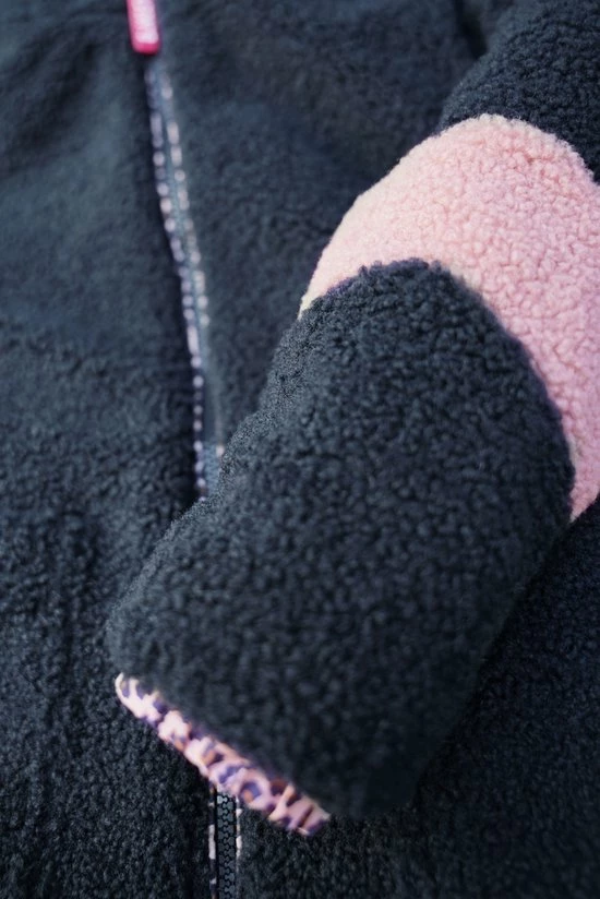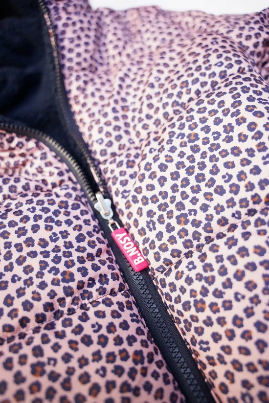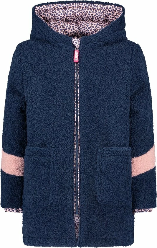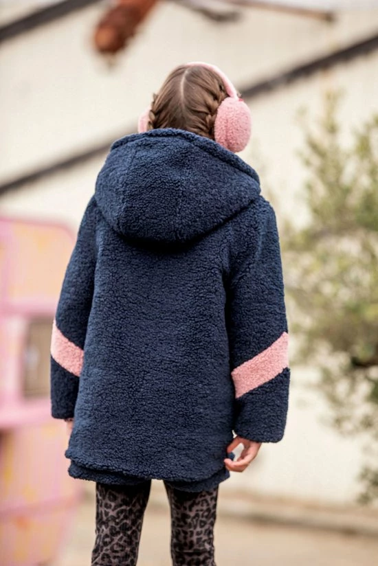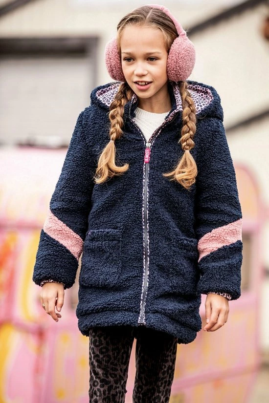 Donker blauwe teddy is niet alleen lekker zacht, maar ook nog eens heel stylish handig, omdat het makkelijk te combineren is. En wil je toch even een statement maken, dan draai je deze B.Nosy jas binnestebuiten en heb je een vrolijke lichtroze luipaard print. En een leuk feitje van deze stof is, is dat hij ook nog eens gemaakt is van 100% gerecycled polyester. Zo zijn we steeds duurzamer bezig.