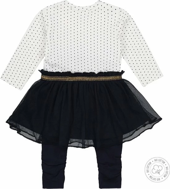 Schattig 2-delig Dirkje babysetje voor meisjes. De top van het jurkje is off-white gekleurd en bevat een navy gestipte all over print. Het rokje is navy gekleurd en is voorzien van een gouden elastiek om de middel. Ook bevat dit setje een navy legging.