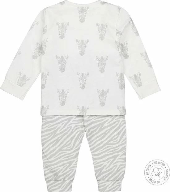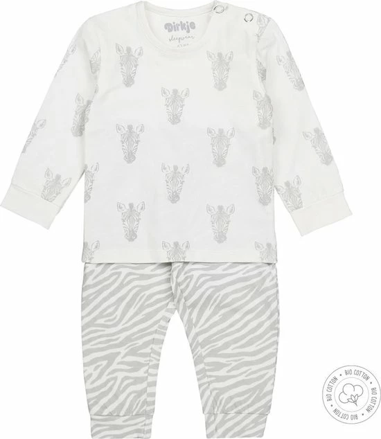 Meisjes baby pyjamaset van Dirkje gemaakt van biologisch katoen. De trui bevat een print van zebra hoofden en de broek een all over zebra print.