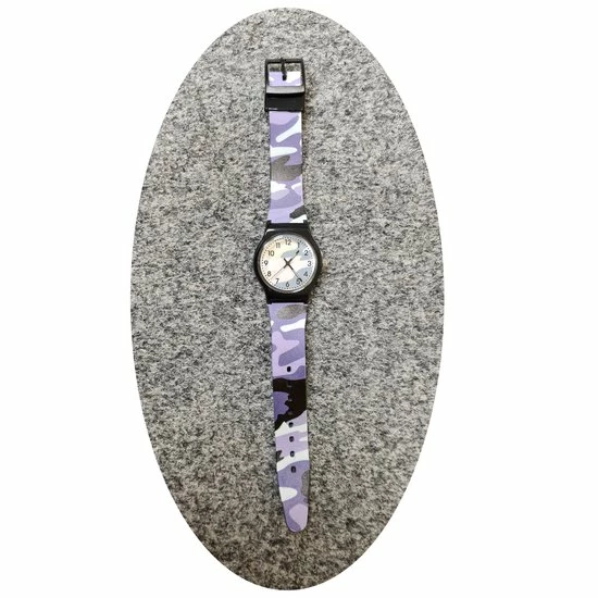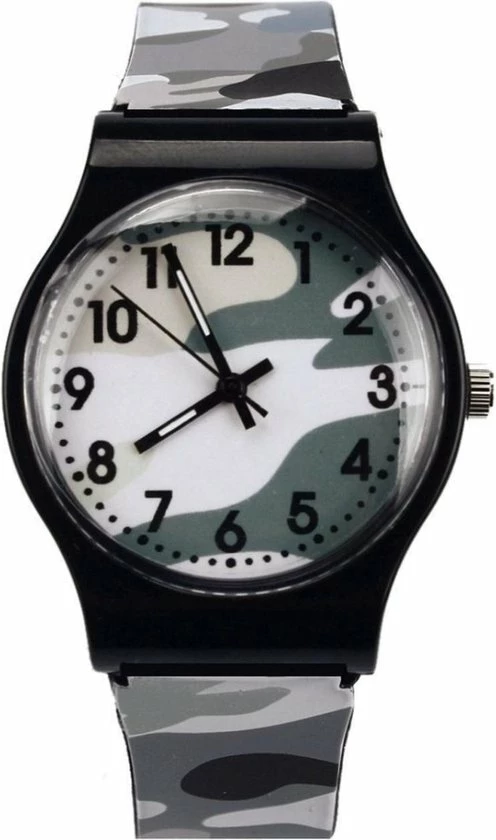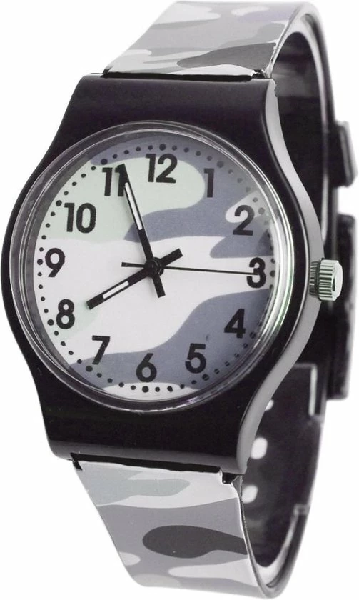 Een stoer Quartz horloge met een gave camouflageprint. Speciaal gemaakt voor coole jongens en meisjes. Het horloge is licht van gewicht en heeft een smalle 33mm kast en is uitgevoerd met een plastic band. De totale lengte van dit horloge is ongeveer 23cm. Hierdoor is het horloge geschikt voor kinderen vanaf ongeveer 8 jaar. Je kunt gaatjes bijmaken/bijponsen indien het horloge niet om de pols past.