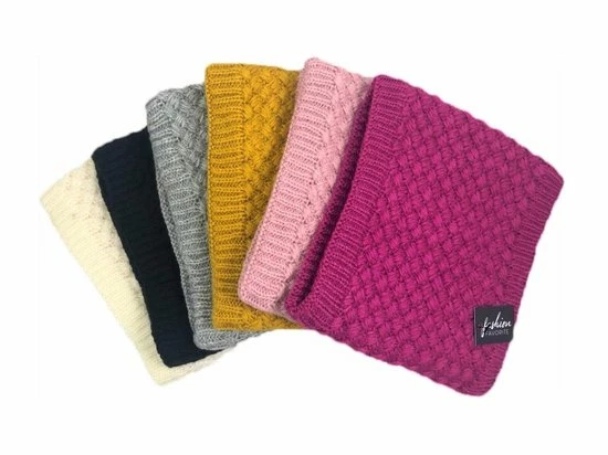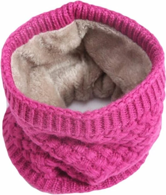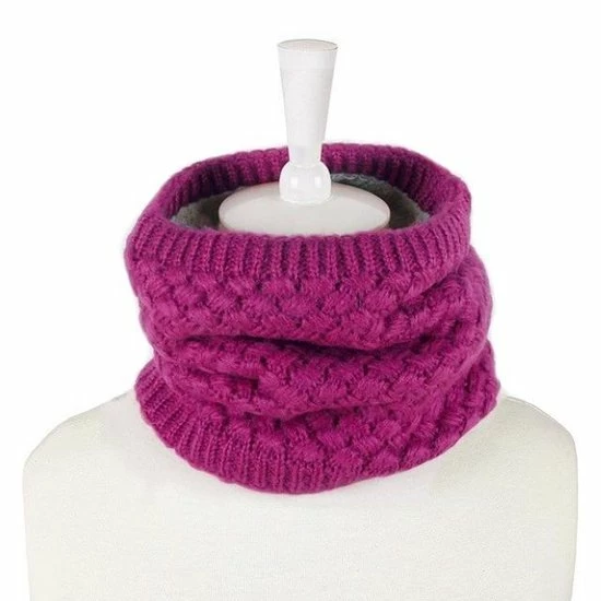 De colsjaal heeft een ingebreid kabelpatroon en zachte binnenvoering van teddy. De breedte is 25 cm en de hoogte is +/-22 cm.