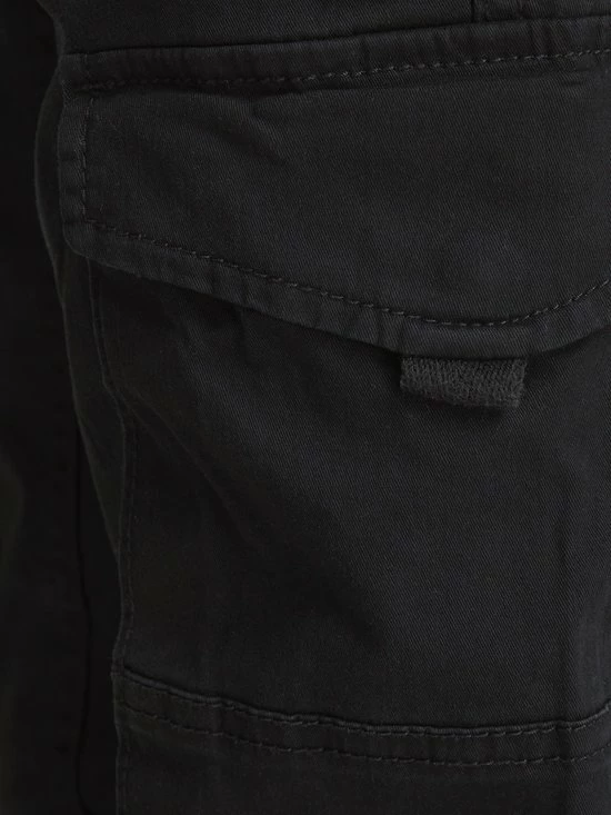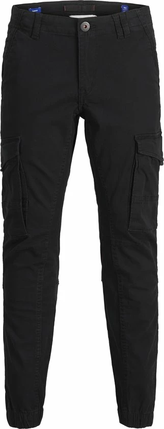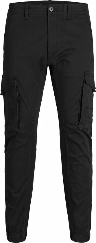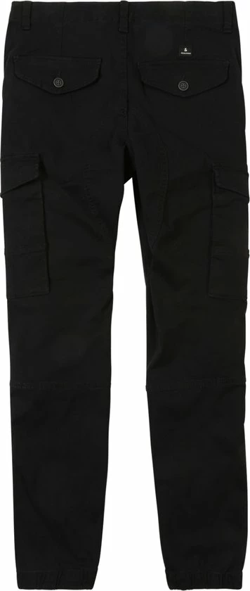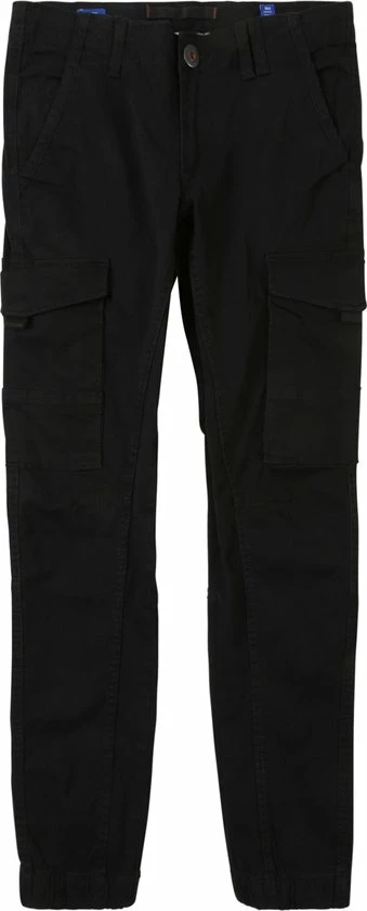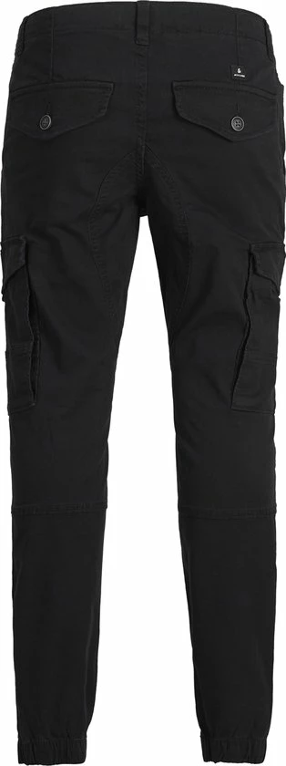 JACK&JONES zwarte cargo met steekzakken en zakken aan de zijkant en elastiek bij de pijp.