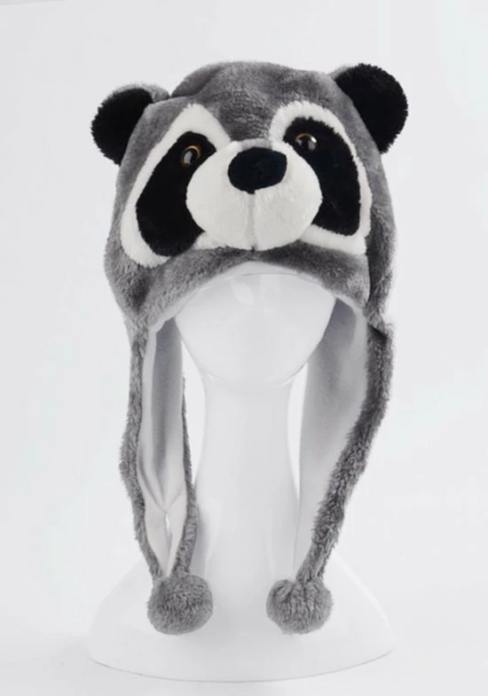 β’ Grijze wasbeer muts met oortjes, flappen en pompoms,