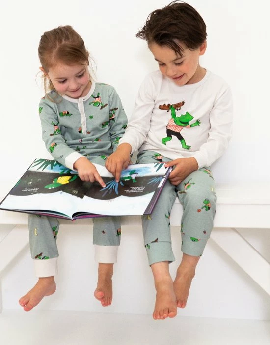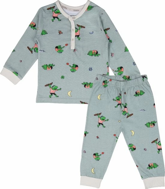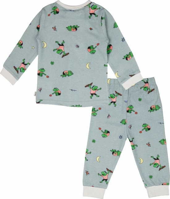 Je kleine zal heerlijk slapen in deze schattige pyjama met het kikkertje Kees van Kuuk’n! De pyjama bestaat uit een lange broek en een shirt met lange mouwen. Zowel het shirt als de broek hebben een printje met het kikkertje Kees.