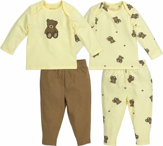 De set bestaat uit 2 pyjama’s die zijn gemaakt van 100% katoen. Hierdoor geniet je kindje van heerlijk zacht en comfortabel slaapcomfort. De pyjama’s hebben een ronde hals, lange mouwen en een broek met lange pijpen en een elastische tailleband. Dankzij de rustige kleuren en de lieve Teddy Bear print combineer je de pyjama’s ook onderling perfect met elkaar. Zo zit je altijd goed en grijp je nooit mis bij vlekken of ongelukjes. Even een nieuw t-shirtje of broekje aan en de superleuke set is weer compleet! De pyjama’s mix en matchen ook heel gemakkelijk met de complete Meyco Baby collectie.