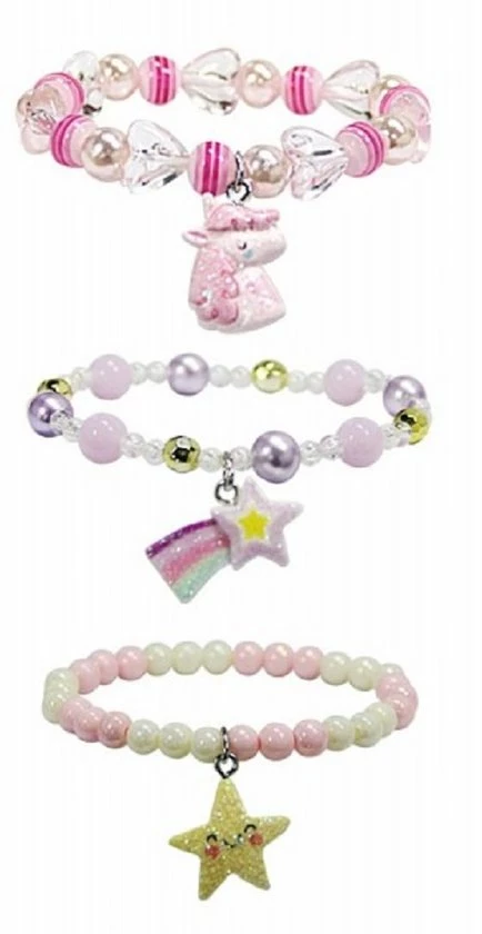 Super schattig setje van 3 elastische armbanden. 1 x paars/zilver/transparante acryl kralen met een vallende ster bedel. 1 x roze/witte/transparant acryl kralen met eenhoorn bedel. 1 x roze/creme acryl kralen met een ster bedel