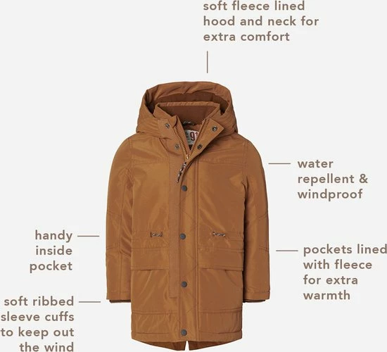 Stoere Noppies Kids jas die tegen een (wind)stootje kan! Jas Nes heeft een met fleece gevoerde capuchon voor extra zachtheid en warmte. Ook heeft de jas gevoerde zakjes en een ritsstopper die de huid van je kindje beschermt. De geribde mouwboorden houden de wind buiten en de armen van je kindje lekker warm. Op de mouw zit een reflecterende batch. Met het striklint in de taille zorg je voor extra shape. De jas is waterafstotend en windproof.