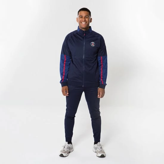 Sportief, comfortabel en stijlvol. Dit PSG trainingspak heren mag niet in jouw collectie ontbreken! Dit trainingspak beschikt over de herkenbare donkerblauwe kleur met rode/navy accenten. Het officiรซle Paris Saint-Germain logo vind je terug op zowel het vest als op de trainingsbroek. Op de achterzijde van het vest, vind je een grafische print met de clubnaam. PSG is jouw favoriete club en dat mag iedereen weten! Verder beschikt zowel het vest als de broek over ritszakken en zijn de pijpen van het broek ook met een rits afstelbaar.
