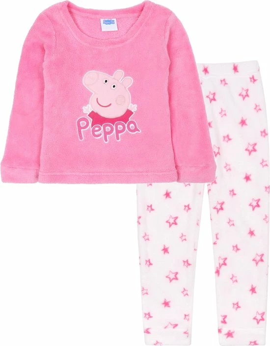 Lange, roze en witte tweedelige pyjama met een terugkerend sterrenpatroon en een geborduurde afbeelding van Peppa Pig.