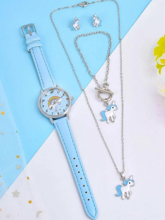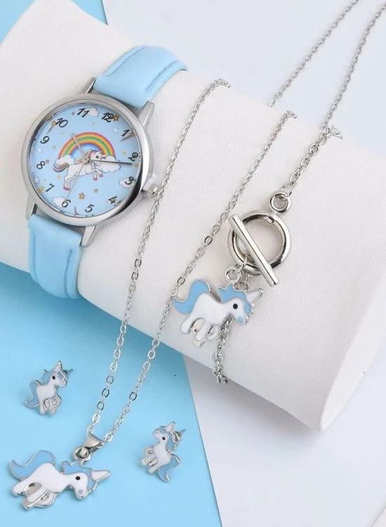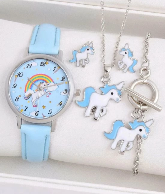 Gloednieuw π Pippashop Kinderhorloge + Sieradenset Unicorn – Eenhoorn – Ketting + Armband + Oorbellen Blauw π