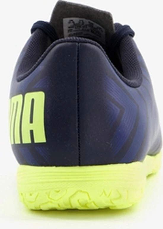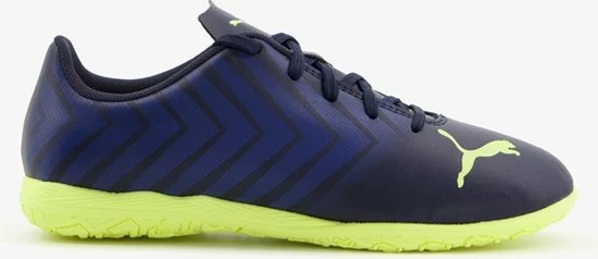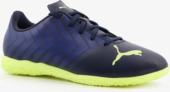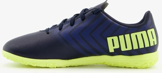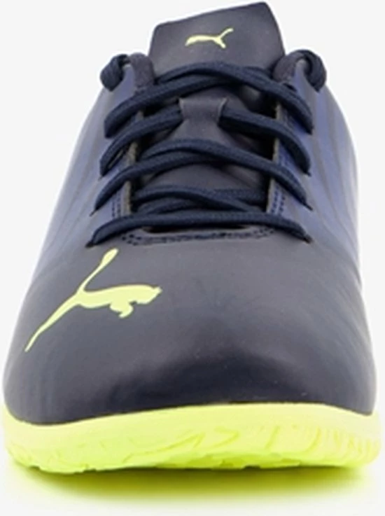Blauwe Puma Tacto II kinder zaalschoenen. Gemaakt van imitatieleer, een binnenwerk van textiel en een stevige non-marking profielzool. De zaalvoetbalschoenen hebben een vetersluiting en vast voetbed van textiel. Voorzien van gele merkopdrukken en accenten op het bovenwerk. De indoor schoenen laten geen strepen achter in de zaal en geven veel grip om snel te kunnen reageren op het snelle zaalvoetbalspel.
