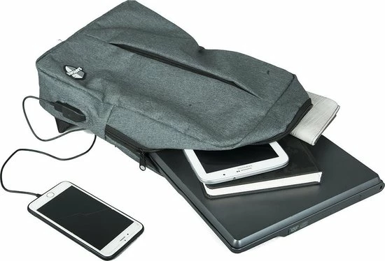 Neem je laptop veilig en gemakkelijk overal mee naartoe in deze SafeSave rugtas met laptopvak. De rugzak is geschikt voor een 15.6 inch laptop. Daarnaast heb je in een ander compartiment nog voldoende ruimte voor andere spullen. De tas beschikt over een USB aansluiting en een apart vak om deze aan te sluiten op een powerbank (niet inbegrepen). Dankzij deze handige feature, kun je altijd en overal je telefoon of tablet opladen.