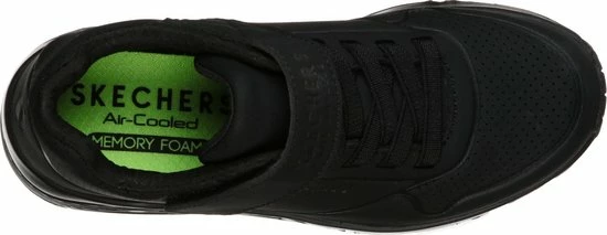 Sportieve zwarte Skechers Uno Air Blitz sneakers, gemaakt van textiel. De comfortabele binnenzool en de voering zijn ook gemaakt van zacht textiel. De sneakers worden gesloten door middel van een vetersluiting. Het klittenbandje zorgt voor extra stevigheid. Dankzij het dempende voetbed met Air-Cooled Memory Foam lopen de schoenen extra comfortabel en hebben ze een ademende werking. De tussenzool met zichtbaar luchtkussen absortbeert schokken bij iedere stap. De zwarte Skechers Uno Air Blitz sneakers hebben een vast voetbed.