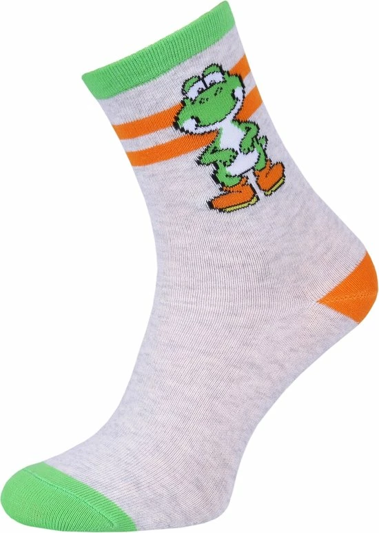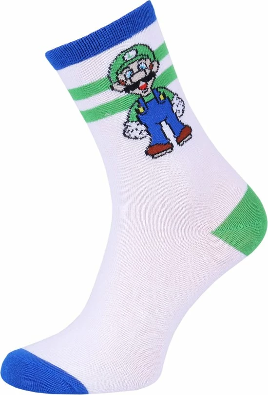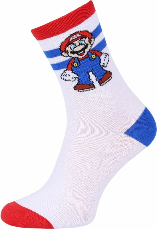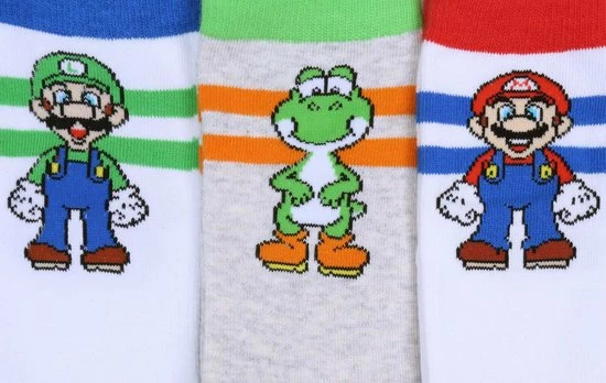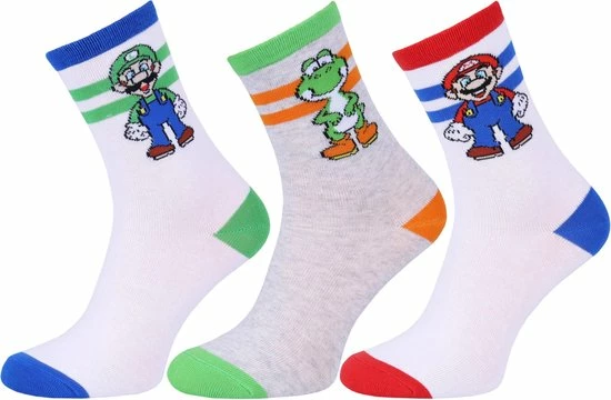 Een set van drie paar hoge jongenssokken met afbeeldingen van personages uit het spel Super Mario.