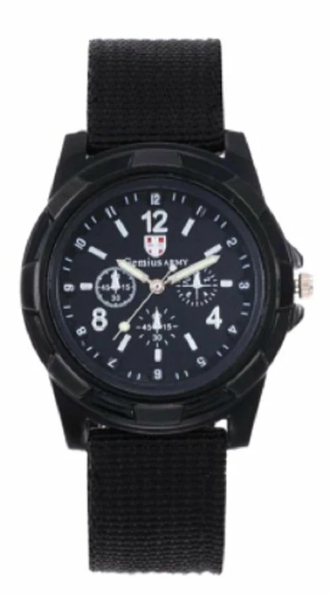 Stoer quartz jongens-/herenhorloge, gebaseerd op de Swiss Army series. Nylon horlogeband, roestvrij stalen achterkant. Spatwaterdicht. Verkrijgbaar in 4 kleuren (blauw, groen, zwart en zwart/wit). De 3 kleine klokjes hebben een decoratieve functie.