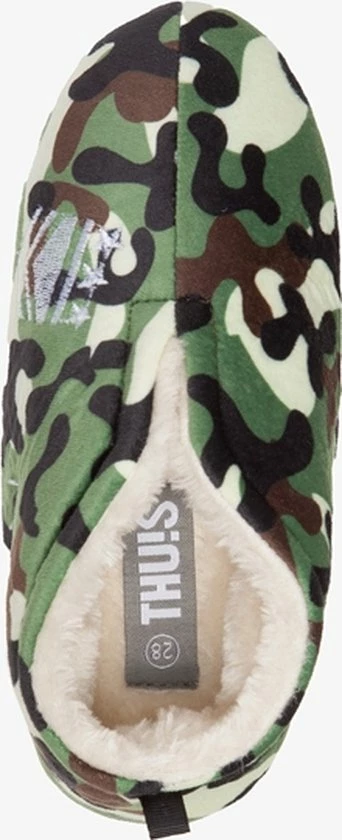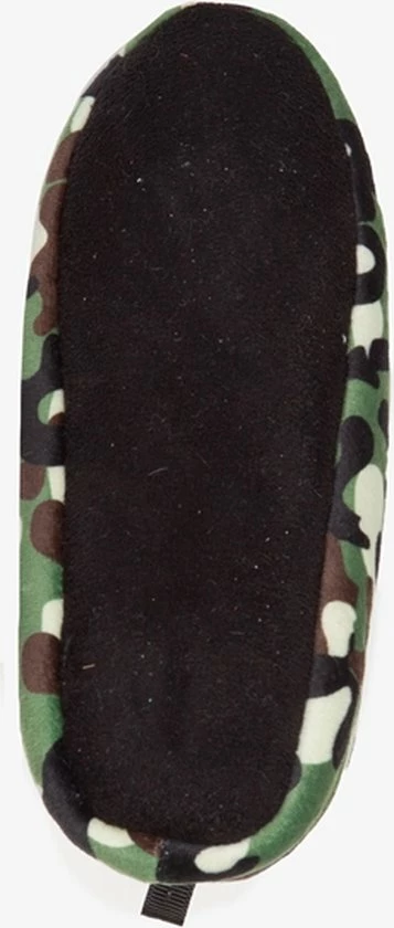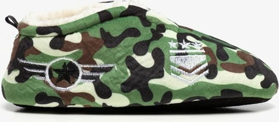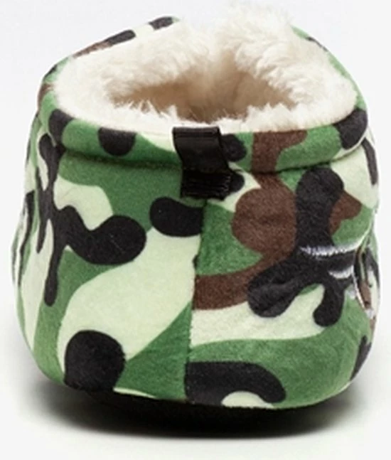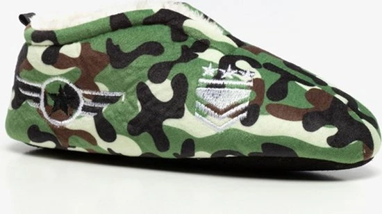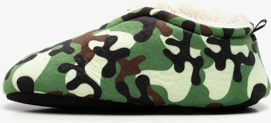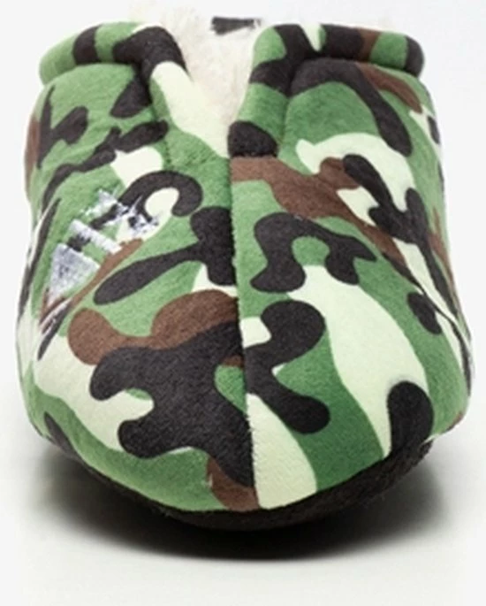 Groene sloffen met camouflage print. Gemaakt van textiel, voorzien van een warme teddyvoering en een antislipzool. De sloffen hebben een hiellusje zodat je ze makkelijk aantrekt.