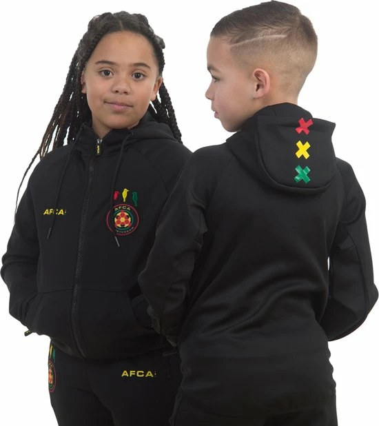 Trainigspak AFCA voor de kleinste ajax supporters. Een echte eyecatcher in de kleur zwart met de rasta kleuren groen geel rood. Mooi afgewerkt met ons AFCA logo met onze birds erboven. Ook te verkrijgen in volwassen maat zodat je samen met je kleine in dezelfde style kunt lopen. Maat is een 137 – 147.