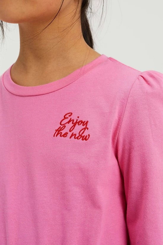 Een regular fit jurk van puur katoen met een embroidery op de borst en een dessin. Het model heeft een ronde hals, lange mouwen, een elastische tailleband en ruffles.
